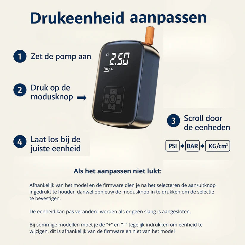 A Airion 4 em 1 é uma bomba de ar elétrica compacta com bateria integrada e visor digital. Basta definir a pressão desejada, premir iniciar e a bomba faz o resto – de forma totalmente automática, com função de paragem automática assim que a pressão correta é atingida.