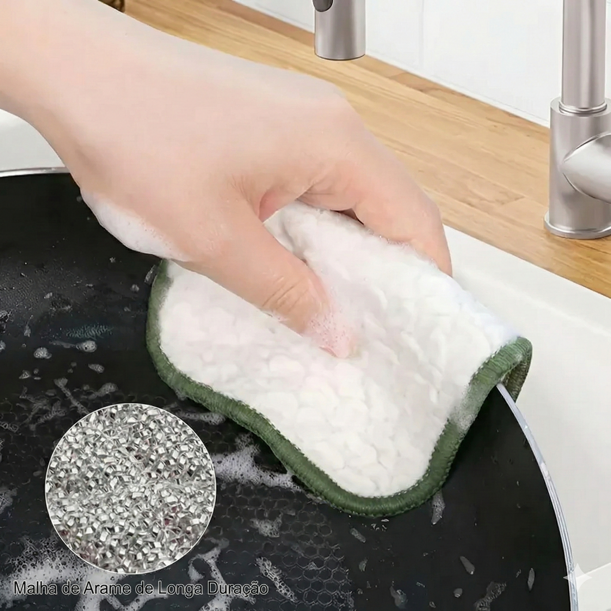 Seguro para todas as superfícies: Concebido para ser não abrasivo, mas altamente eficaz, o nosso pano de cozinha de arame limpa fogões de vidro, cerâmica e panelas antiaderentes em segurança. As fibras de arame à prova de ferrugem garantem durabilidade sem danificar os seus utensílios de cozinha.